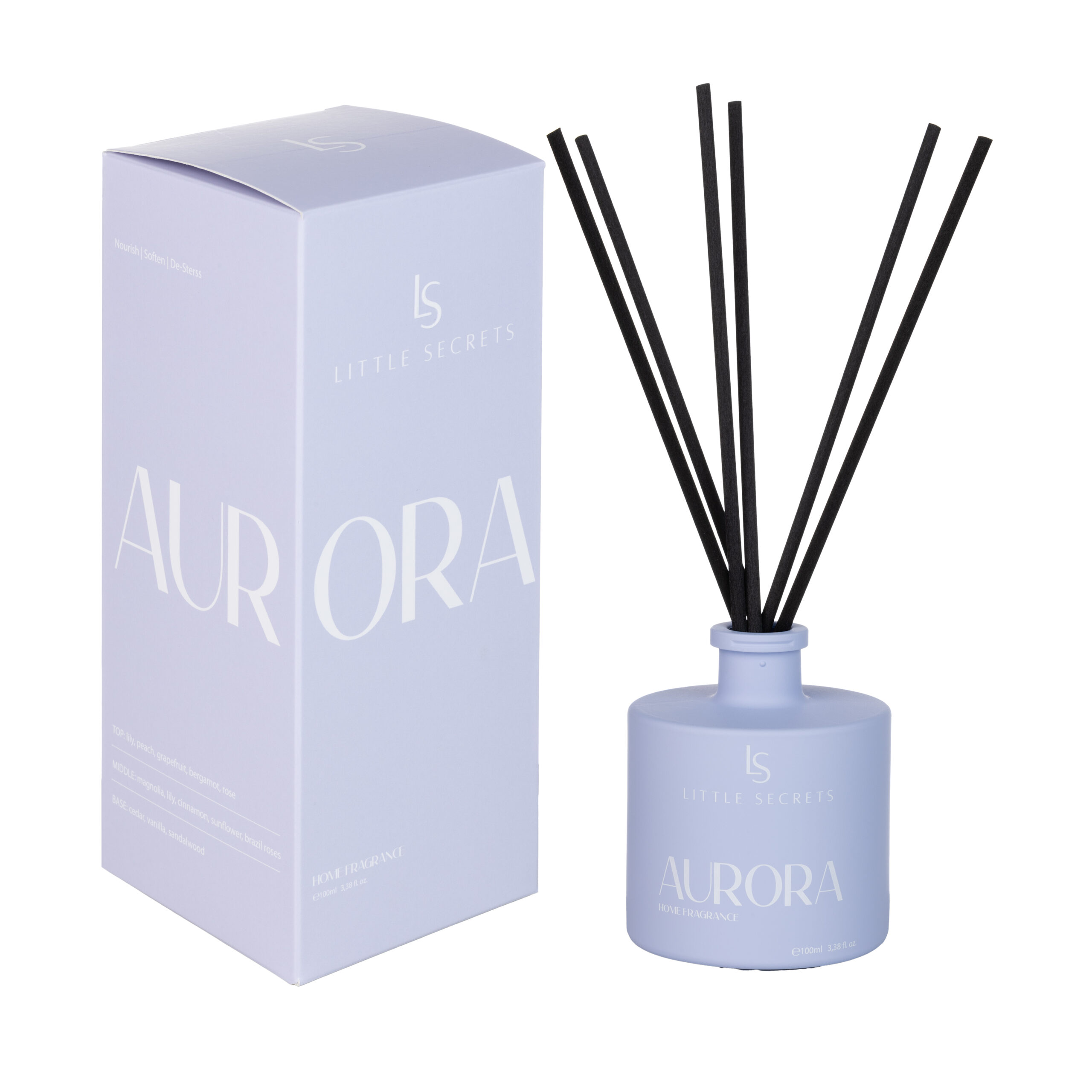 Ο Aurora Home Diffuser της Little Secrets είναι ένας οικολογικός, μη αλκοολούχος αρωματιστής χώρου 100 ml, που διαχέει απαλό, φωτεινό άρωμα με νότες κρίνος, ροδάκινο και σανταλόξυλο, δημιουργώντας μια χαλαρωτική και κομψή ατμόσφαιρα.